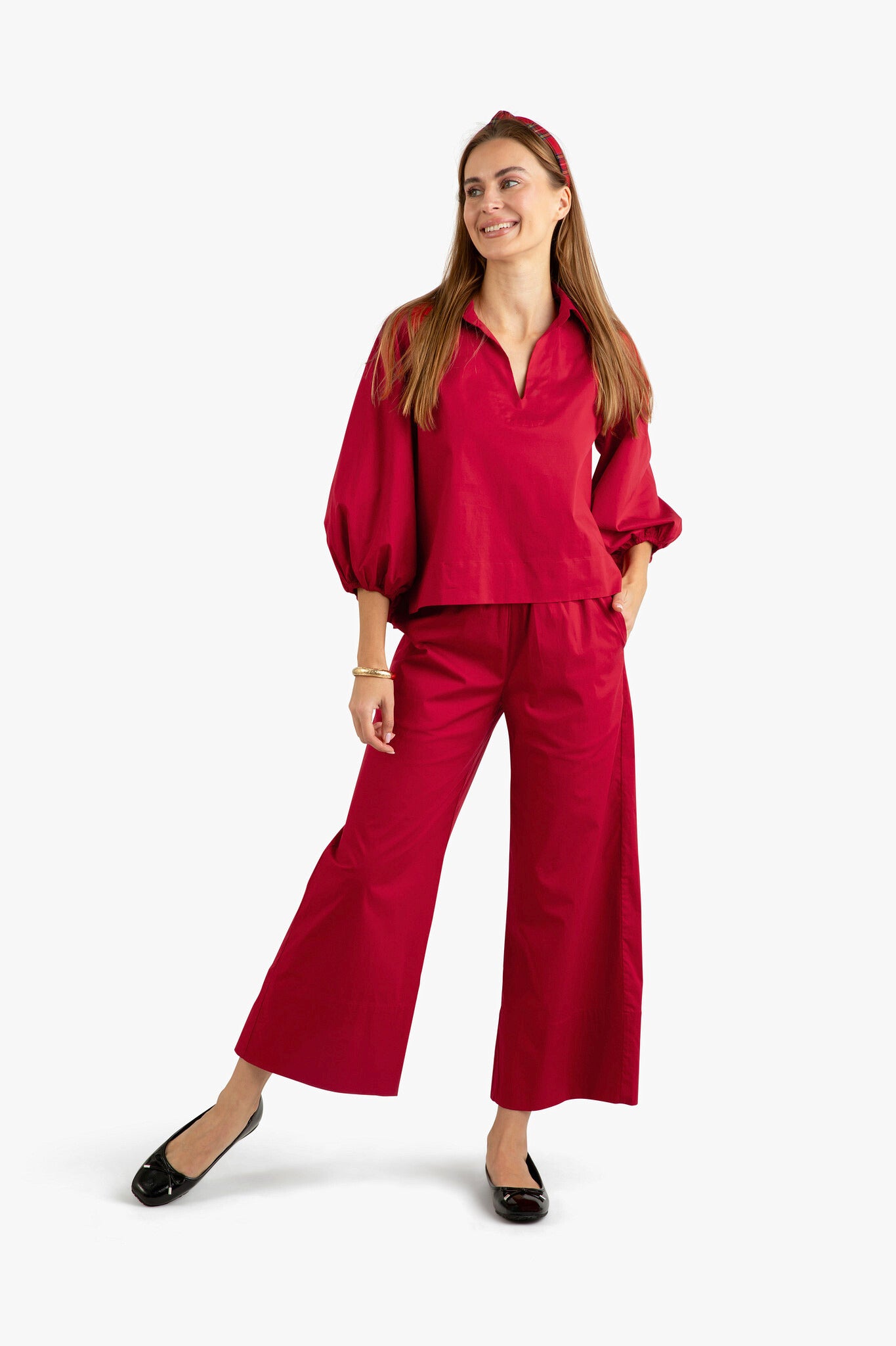 Our bestselling Take Pause Set is now available with a longer pant that feels just as relaxed as the original. Easy-to-wear and incredibly versatile, this matching two-piece set in the perfect shade of crimson red for the holiday season. Pair with black or gold flats, or an animal print shoe, for a festive outfit that looks and feels effortless. Each piece can be worn separately too: pair the top with your favorite denim or a gathered skirt, and the throw-on-and-go pants are perfect with a white blouse or our coordinating top in Merry Plaid. Pamper yourself in comfy-chic clothes that look put together at home on the go. Exquisitely crafted with ultra-premium cotton poplin enhanced with a hint of stretch for luxurious comfort.