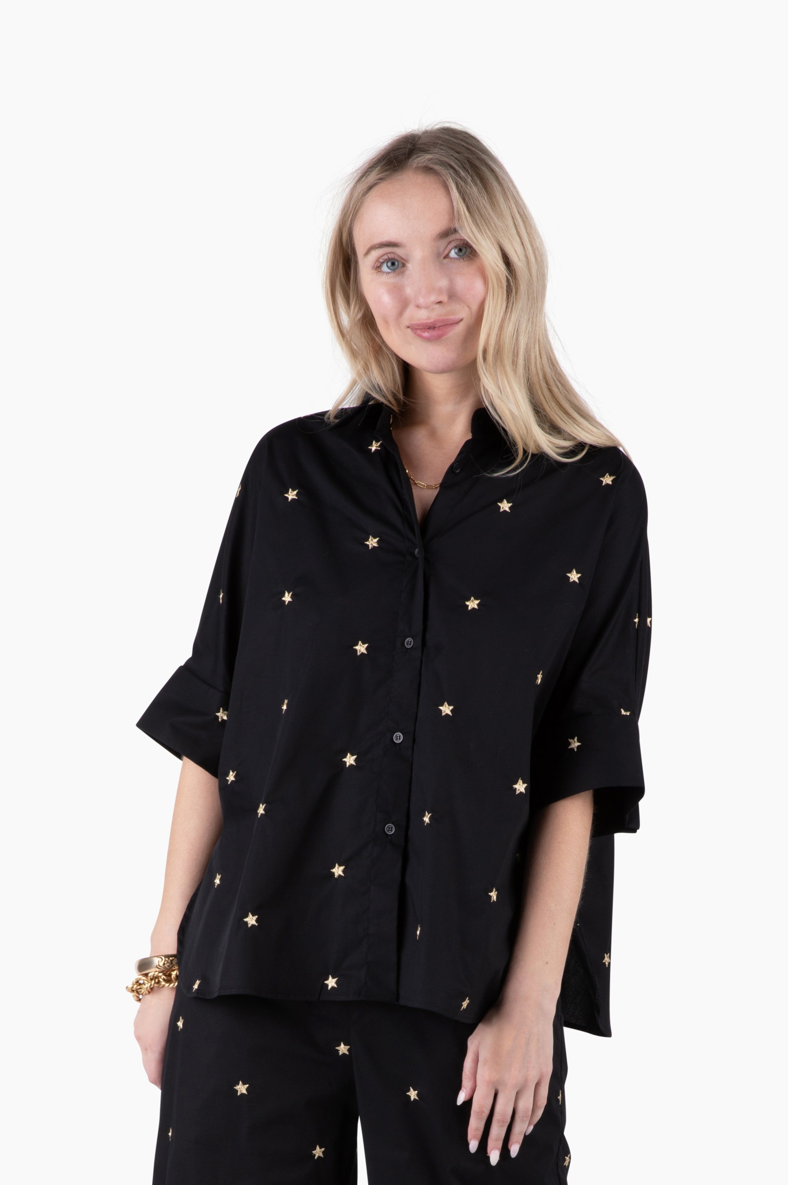 The new Peacemaker Top in Gold Star, is the perfect blend of elevated comfort and effortless style. Embroidered in gold metallic stars, this festive shirt has side slits, cuffed sleeves and a relaxed, swing back that moves effortlessly when you move. You'll enjoy endless style you can wear all season long. The versatile Peacemaker Top can be paired with the matching Take Pause Pant or with denim for an easy outfit that looks as good as it feels. Exquisitely crafted with ultra-premium cotton poplin enhanced with a hint of stretch for luxurious comfort for wherever the day or night takes you.